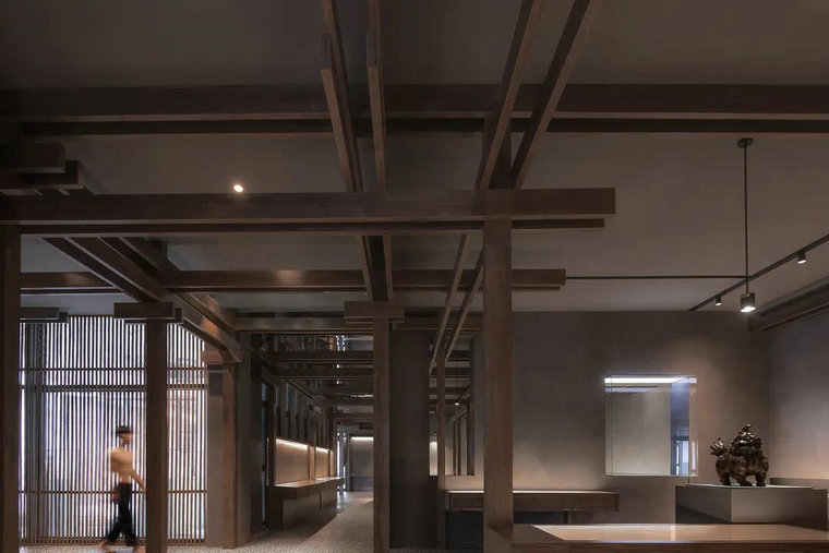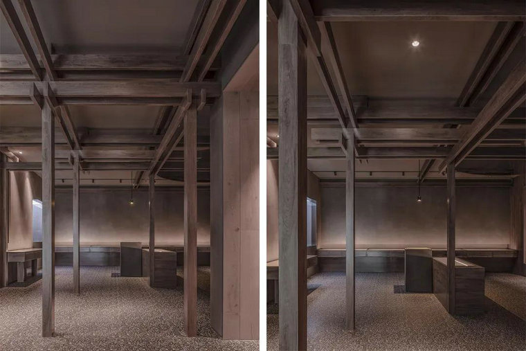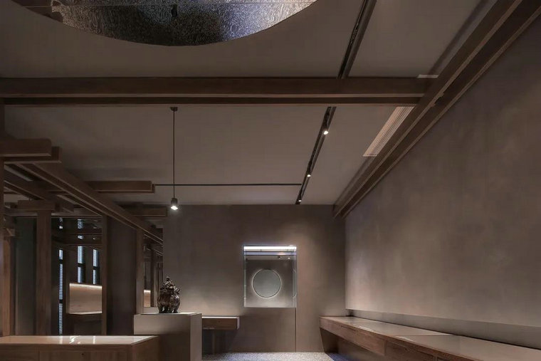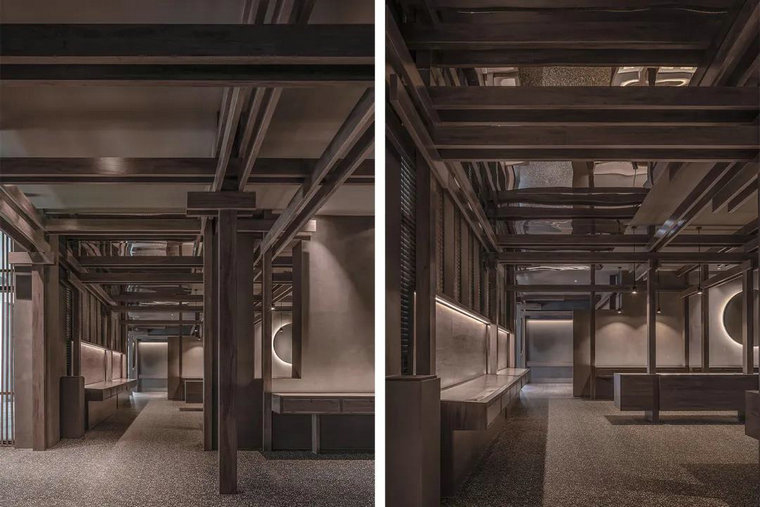 材質(zhì),往往賦予空間質(zhì)感與情緒表達。多維化內容呈現,在不同時(shí)段,伴隨著(zhù)人群、光線(xiàn)、甚至空間中氣息的變化,讓其整體充滿(mǎn)了流動(dòng)之美。結構層次的陣列排布,乍看之下冷峻而秩序井然。深灰色水磨石的存在烘托出空間的古典氣質(zhì),其走勢亦于無(wú)聲處引導著(zhù)觀(guān)者情緒與步伐。