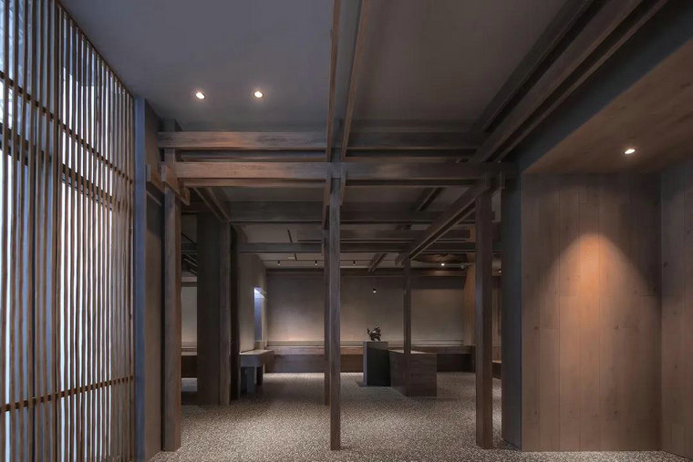 寧靜深邃的氛圍中皎潔的白光,如皓月清暉,遠處影影綽綽的自然光從柵格屏風(fēng)中透入,賦予空間純粹自然的美感。質(zhì)感細膩的深灰色水磨石鋪貼強化了博物館原有的神圣感和莊重感。