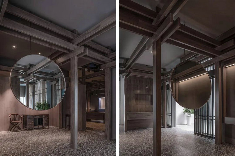 說(shuō)到博物館大部分人會(huì )想到明亮的環(huán)境,豐富的造景,精致的展品,和繁雜的分區等等,而本案這個(gè)律師博物館十分特別,是南京歷史上第一所律師博物館。與其說(shuō)這是博物館,其實(shí)更像一個(gè)“書(shū)架”,將南京法律和律師的歷史細致梳理。每一個(gè)年代下具有代表性的行業(yè)人物和事件,像一本本書(shū),在法律框架的系統和時(shí)間軸線(xiàn)上被封存。設計師將傳統與現代的設計技法和元素巧妙融合,選擇深灰色水磨石瓷磚和原木架構的組合,可謂別出心裁。中式柵格與極簡(jiǎn)鏡面的疊搭,碰撞出非凡的視覺(jué)效果,讓觀(guān)者能在古典建筑形態(tài)結構和簡(jiǎn)約的空間布局中感受莊重肅穆的美,最終將哲思落在法律本身。