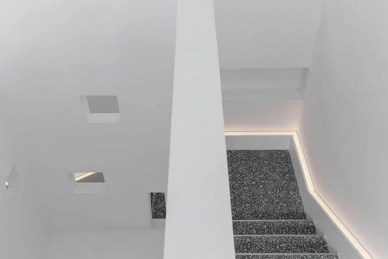 在樓梯間的設計中,設計師通過(guò)反差設計的手法,利用建筑的語(yǔ)言構建一個(gè)純粹明朗的空間,深灰色水磨石瓷磚在其中呈現獨特的意韻。留白墻體的矩形鏤空,將樓梯道的自然光引入到建筑體內,建立了一個(gè)極具儀式感和信仰感的連接空間。